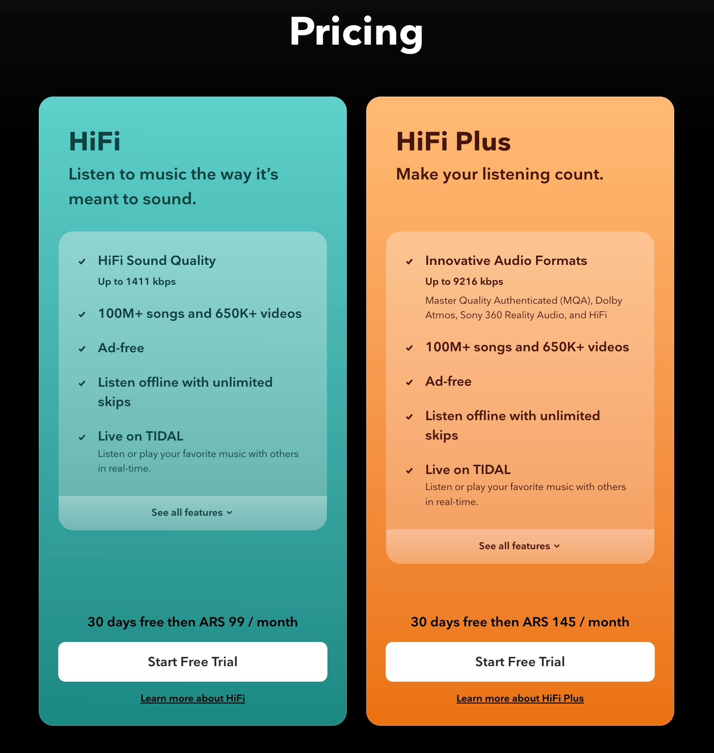<figure><img src="https://3361558420-files.gitbook.io/~/files/v0/b/gitbook-x-prod.appspot.com/o/spaces%2FyK34X43VQWMbEBAzBDqy%2Fuploads%2FAYjeLUjOB6Llzhj11HXL%2Ftidal%20plus.jpg?alt=media&#x26;token=6e3220fe-e69b-455b-ac83-824c35c839df" alt="" width="563"><figcaption><p>Gói Tidal HiFi Plus cá nhân, giá sẽ thấy để $145 nhưng không phải đơn vị Đô la mà là đồng ARS.</p></figcaption></figure>